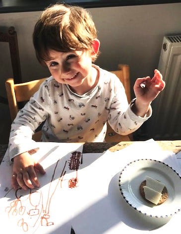 The hardest of times are tightly bound up with the best of times. When we are in survival mode, we feel properly alive. It’s not easy. Life feels hard for a long while. But it shows you what you’re made of. I am always keen to hear from people on how they are navigating loss. And that means loss of anything, person, place or thing, a sense of yourself you’ve left behind in another life… writing triggers a process, a sense of something evolving, something growing. Below are some boring instructions and some pictures of James and his art. Thank you for reading.